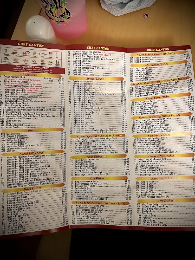 Chef Canton's menu is a comprehensive array of traditional Chinese dishes, offering comfort food for any occasion. Entering into their appetizers, crispy aromatic duck and chicken combine perfectly with savory sauces to ignite your taste buds. Soups such as Sliced Fillet Steak with sweetcorn provide heartwarming warmth. For the main course, the O.k dishes and kung po selections stand out with generous portion sizes. Szechuan and curry dishes feature in abundance, showcasing a perfect blend of spices for those craving something bold. There's no shortage of vegetarian options too, ensuring that everyone can find something to relish. From delectable satay to sweet and sour creations, each dish invites you to explore mouth-watering flavors. Desserts are also available, rounding out the culinary experience. With 21 categories of dishes, including 10 unique curry plates and various duck dishes, the menu promises no lack of choices.