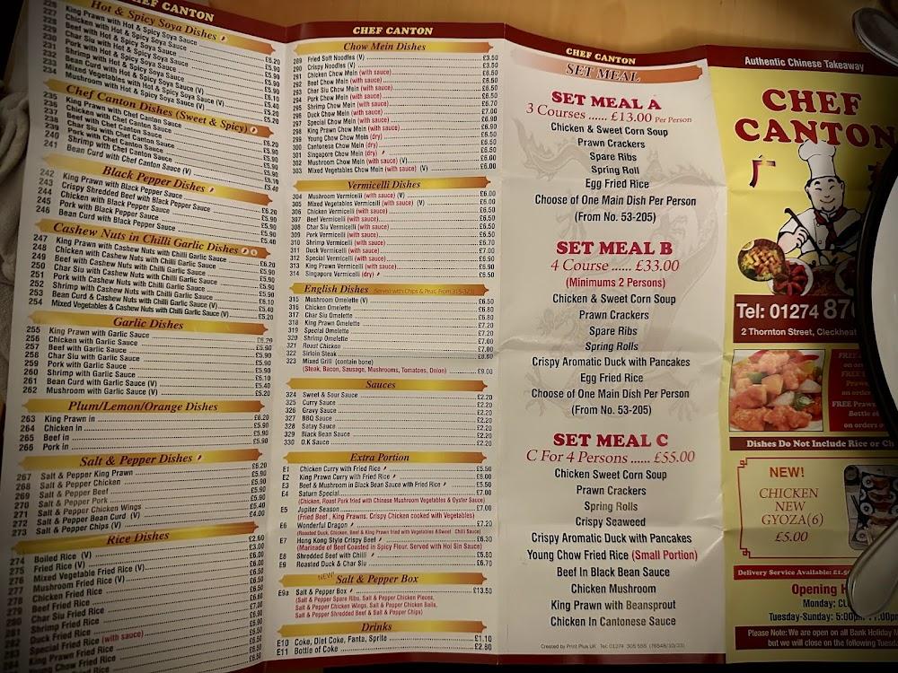 Located at 2 Thornton St in Rawfolds, Cleckheaton, Chef Canton stands out as a neighborhood gem for lovers of Chinese food. This restaurant welcomes all guests with its casual vibe and wheel-chair accessible amenities, ensuring comfort for everyone. Free street parking simplifies access, making it convenient for diners. Open every day of the week, it’s an essential spot for Chinese cuisine enthusiasts. Whether you're grabbing a quick takeaway or enjoying table service, the team at Chef Canton prides itself on providing efficient service without compromising the dining experience. Featured in various local reviews, many patrons praise the restaurant for its generous portions and delightful flavors. The culinary team focuses on using quality ingredients, which reflects in their popular dishes. With its commitment to customer satisfaction, Chef Canton not only serves excellent meals but also fosters a sense of community among its visitors, making each dining experience feel special.